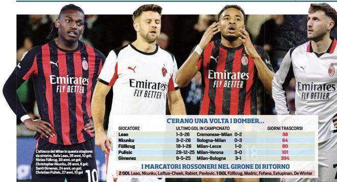 恩昆库进球荒超过64天,法国人最近一次进球是2026年2月3日对阵博洛尼亚,但他的上一粒运动战进球更要追溯到2026年1月11日对阵佛罗伦萨,换言之,如果去掉点球,恩昆库的运动战进球荒跨度更为惊人。最“年轻”的进球荒属于莱奥,2026年3月1日,他在客场对阵克雷莫纳的比赛中打入一球,这也成为AC米兰所有前锋最近的最后一粒进球。距今,已经是38天之前了。