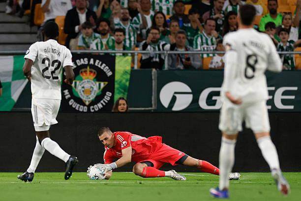 然而这里不是伯纳乌,贝蒂斯球迷更想看另一个巴西人表演。安东尼和另一侧的阿卜德轮番出击,几次围攻皇马禁区几乎得手。在这种相互“围魏救赵”的奇异情境下,贝蒂斯的攻门质量反而显得更高一点。卢宁在十几分钟内几乎透支了自己的“神扑”额度,一波高接抵挡的三连扑让贝蒂斯球员懊恼,更映衬出皇马球员的麻木。好像没人愿意为这种险情担责任。