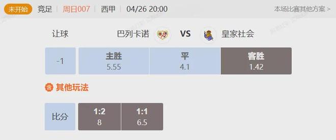 目前竞彩数据来看,给出对两队基本均势看待,巴列卡诺的主场优势基本没有体现,本场看皇家社会不败。
